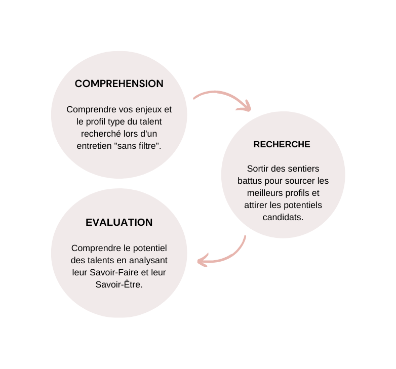 Je vous aide à recruter des talents indispensables pour vous permettre de réaliser vos objectifs. Pour cela, le processus passe par trois piliers :